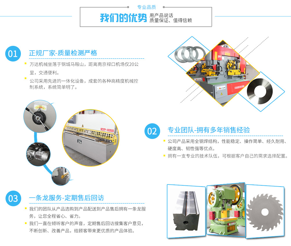 馬鞍山萬達機械科技有限公司是在新形勢下投資新建的高新技術企業,成立于2013年,專業生產銷售各類折彎機,剪板機、卷板機、沖壓機、鱷魚式剪切機,金屬液壓打包機,液壓聯合沖剪機,數控刀模具等。經營過程中采取先進管理模式,引進先進的技術,在產品質量上不斷向更高層次邁進。在人力資源開發中,堅持“以人為本”的管理理念,專業為航空、輕工、冶金、化工、建筑、汽車、電力、裝潢等行業提供所需要的專用機械和成套設備。 本公司經營主導產品有:液壓折彎機、剪板機、卷板機、沖床,鱷魚式剪切機,金屬液壓打包機;剪板機刀片、折彎機模具、圓刀片、攪拌機合金耐磨等機械成套設備和配件。對于客戶特殊要求的非標準產品,也是我們技術開發計劃中深化改革的一項重大舉措。讓每一個客戶滿意,才能真正實現國際化,集團化的營銷市場。通過經營過程中不斷追求...榮譽資質
